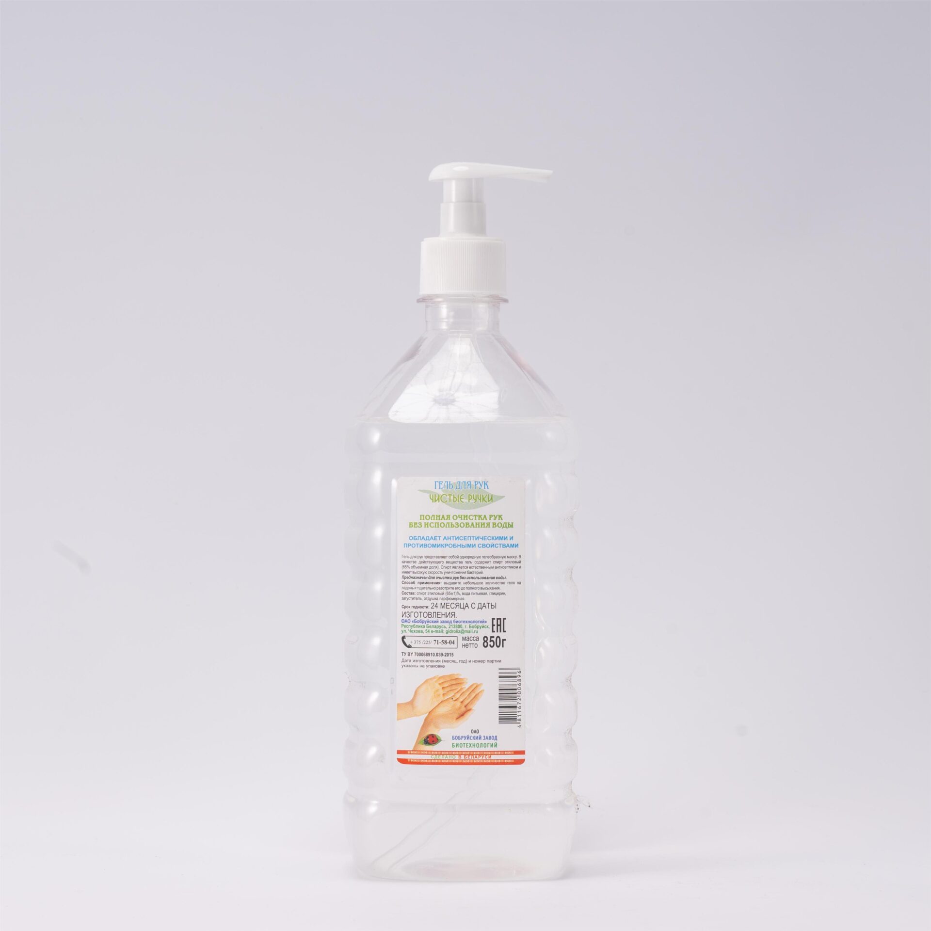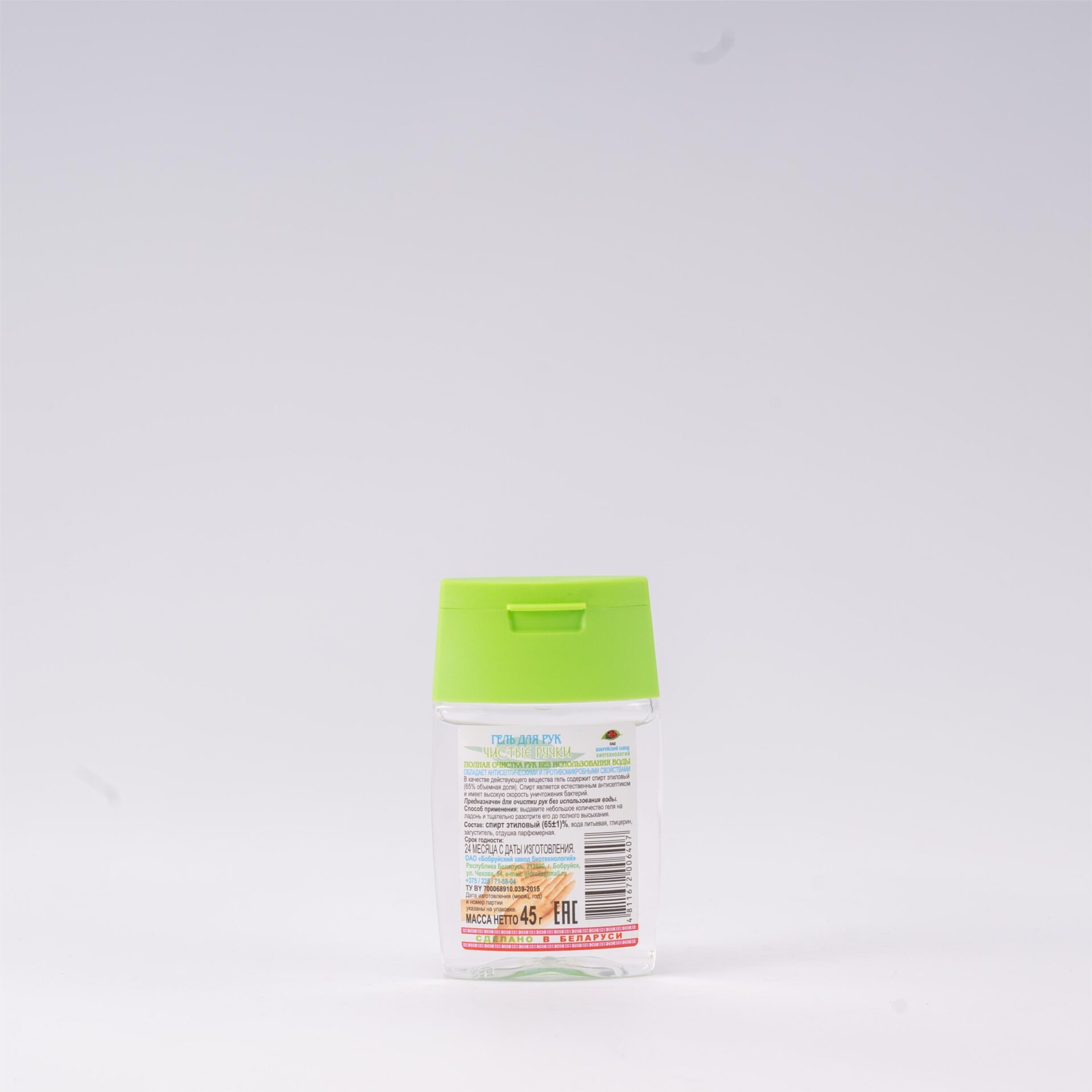 Представляет собой однородную гелеобразную массу. В качестве действующего вещества гель содержит спирт этиловый (65% объемная доля). Спирт является естественным антисептиком и имеет высокую скорость уничтожения бактерий, а также обладает бактерицидным действием в отношении большинства грамположительных и грамотрицательных бактерий.